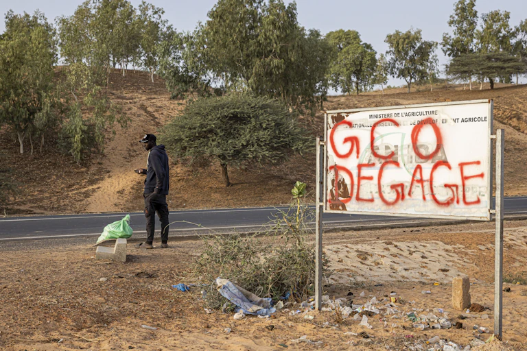 Un homme se tient à côté d'un panneau indiquant « Grande Côte Operations (ancien nom d'Eramet Grande Côte) Dégage» à Lompoul, le 11 février 2025. PATRICK MEINHARDT/AFP via Getty Images