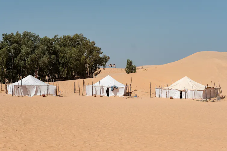 Des touristes montent à dos de chameau derrière une rangée de tentes dans un écolodge à Lompoul, le 17 novembre 2023. GUY PETERSON/AFP via Getty Images
